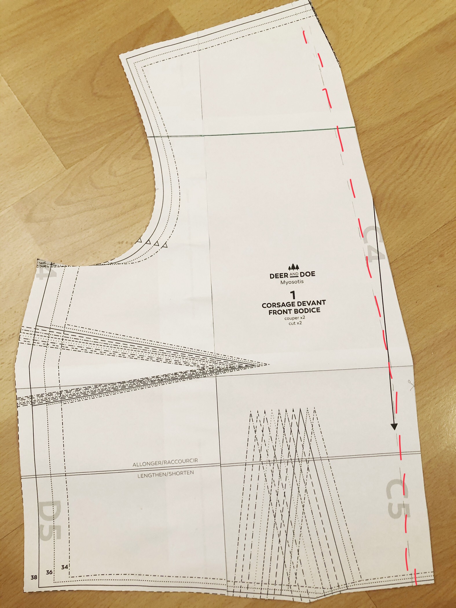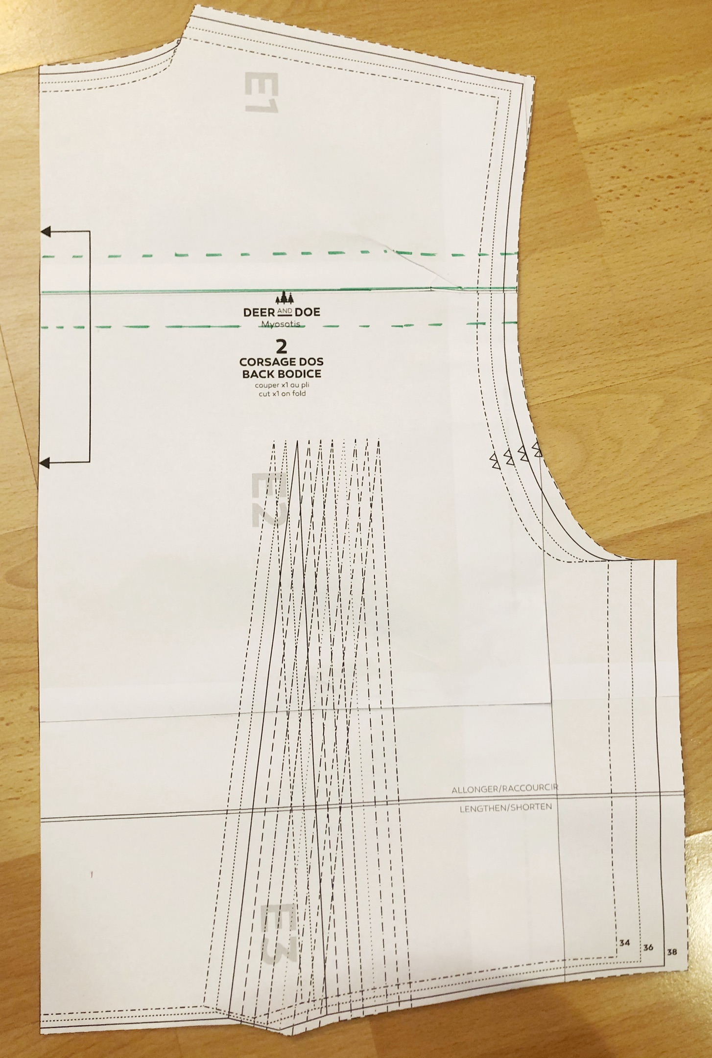 Ve střihu jsou švové přídavky už zahrnuty, takže prvním krokem bylo jejich vyznačení do střihu. Začala jsem u středového okraje, vyznačila si, kde začíná samostatná léga, a pak paralelně ve vzdálenosti požadované šířky légy nakreslila kde léga končí, a pomocí další paralelní linie i konec odpovídajícího švového přídavku. Na obrázku vlevo jsem rovnou čarou vyznačila légu samotnou a přerušovanou čarou švové přídavky. Výsledný díl jsem obkreslila na střihový papír a odstřihla ho (a zapomněla vyfotit). Na obrázku vpravo vidíte výsledný přední díl. Můžete si všimnout, že jsem ho odstřihla v místě, kde má reálně začínat léga, ale zapomněla jsem přidat na novou středovou linii předního dílu švový přídavek, takže to bylo třeba udělat až na látce.