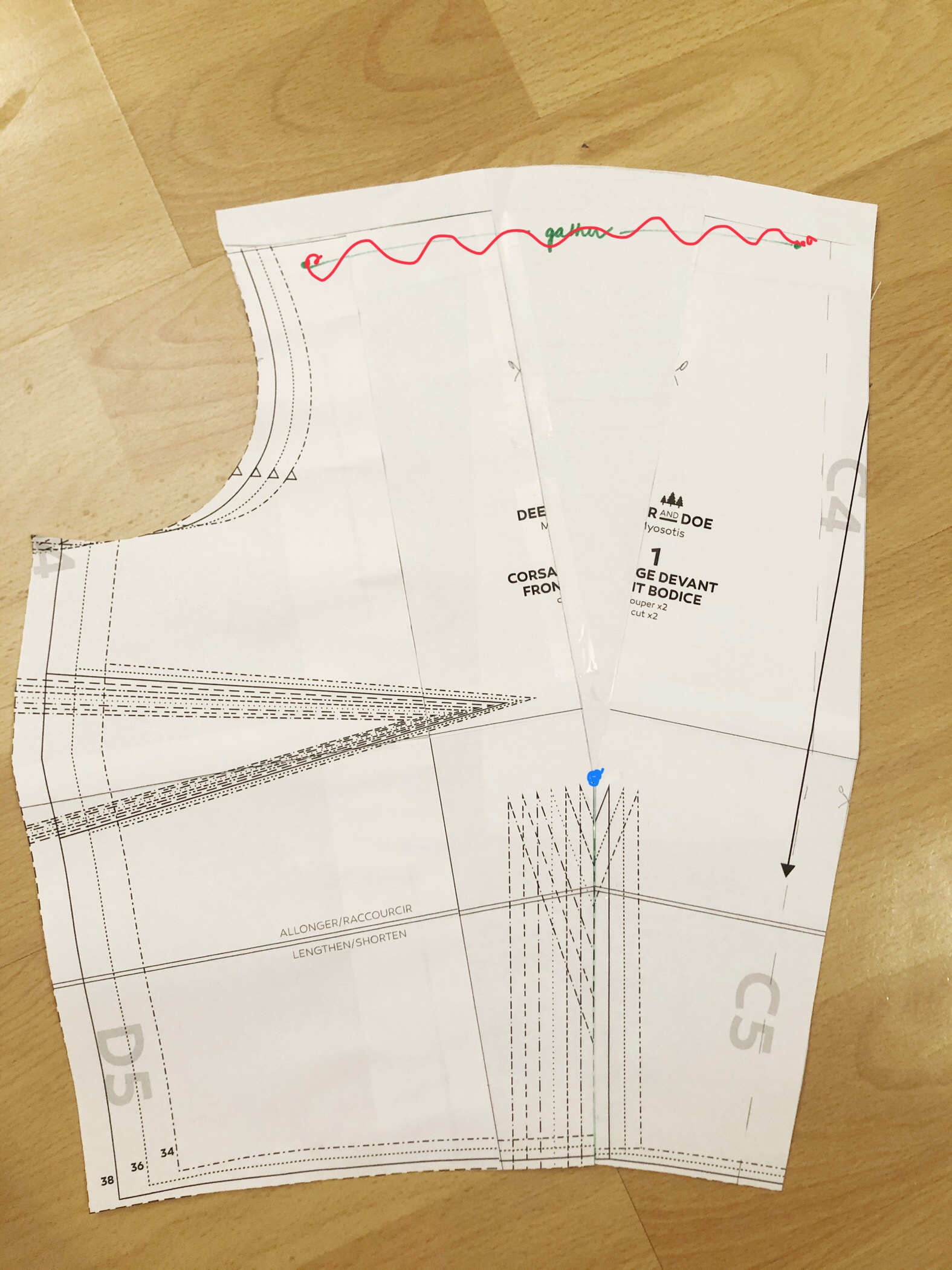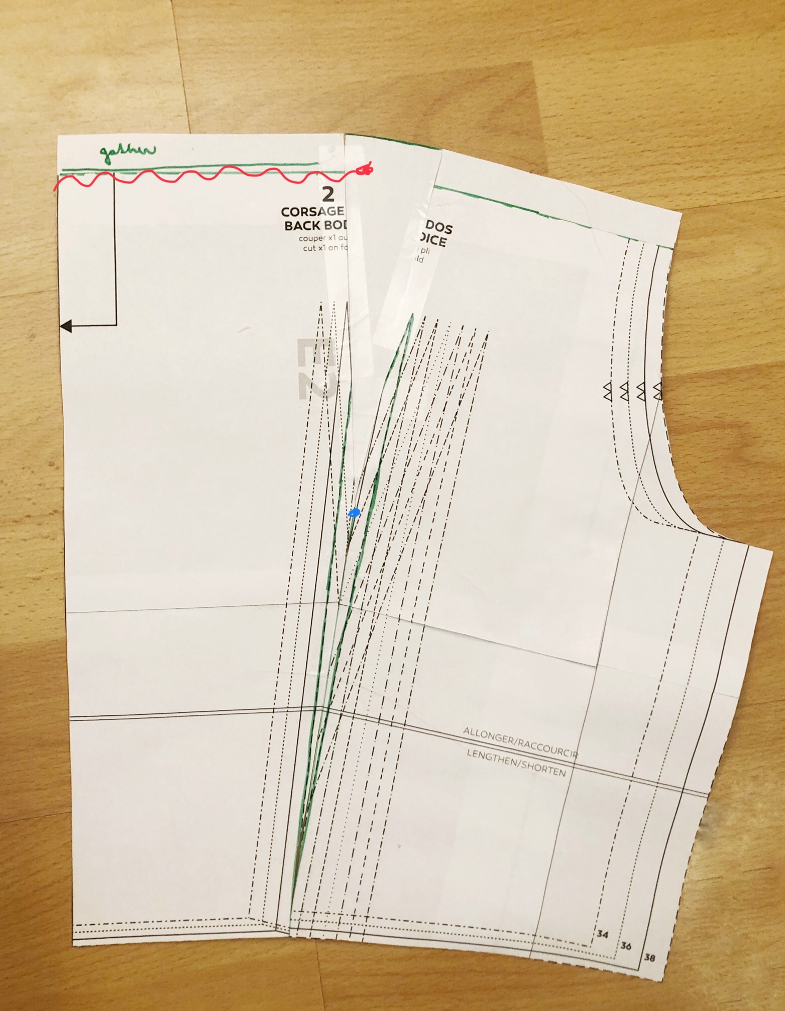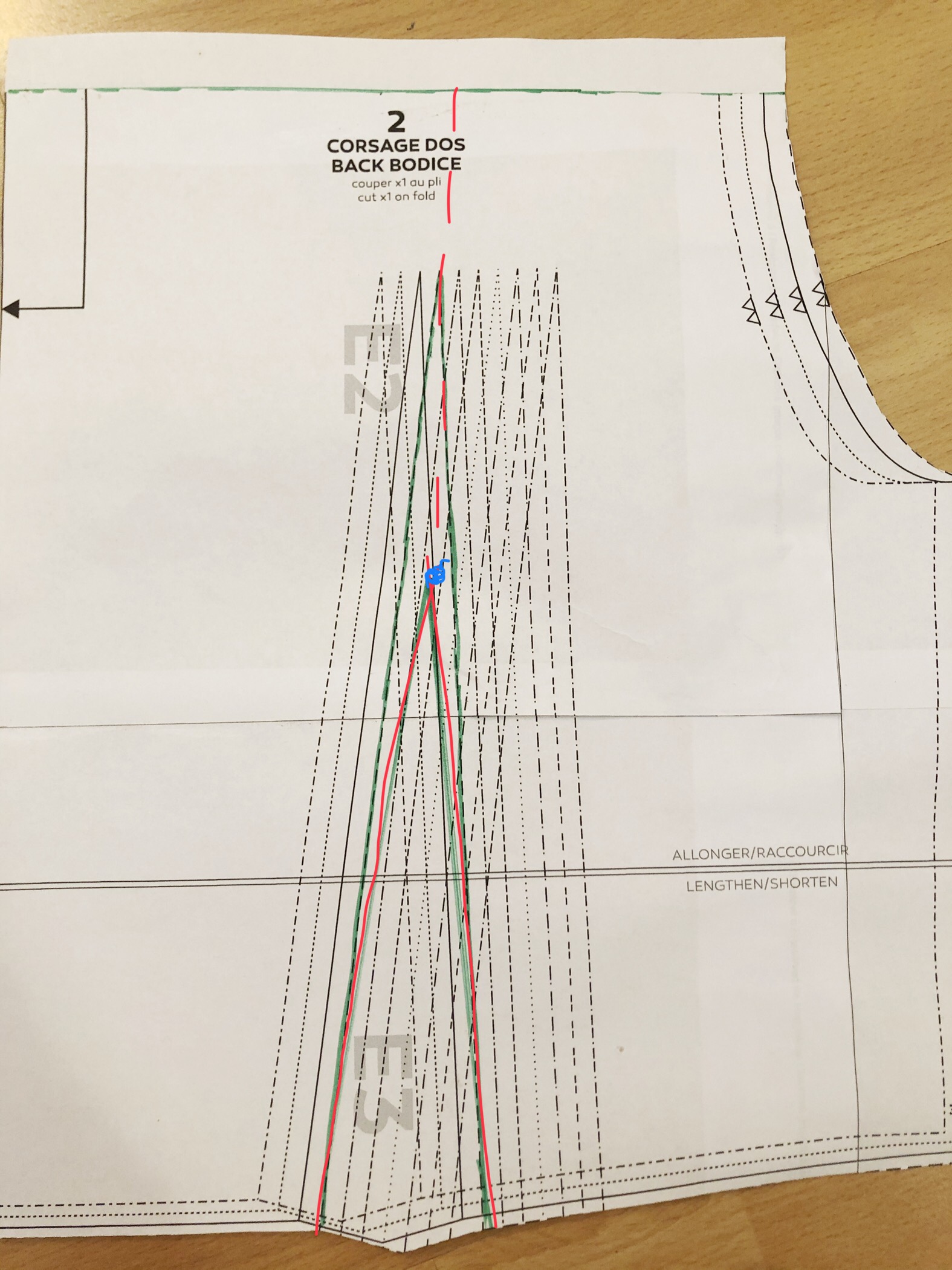 Velmi podobný postup jsem zopakovala i na zadním dílu, kde jsem si nejprve opět vyznačila linii sedla, švové přídavky, a pak sedlo obkreslila a odstřihla. Potom jsem zavřela pasový záševek a převedla ho do řasení navrchu. Jediným rozdílem bylo, že vzhledem k tomu, že záševek sahal téměř až k nové linii sedla, nejdřív jsem si ho snížila – novou špičku záševku vidíte na fotce vyznačenou modrou tečkou, ke kterou jsem spojila s původními konci záševku. Až poté jsem se střihem dál manipulovala a přesunula záševek do horního řasení.