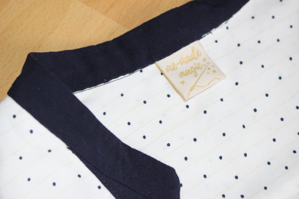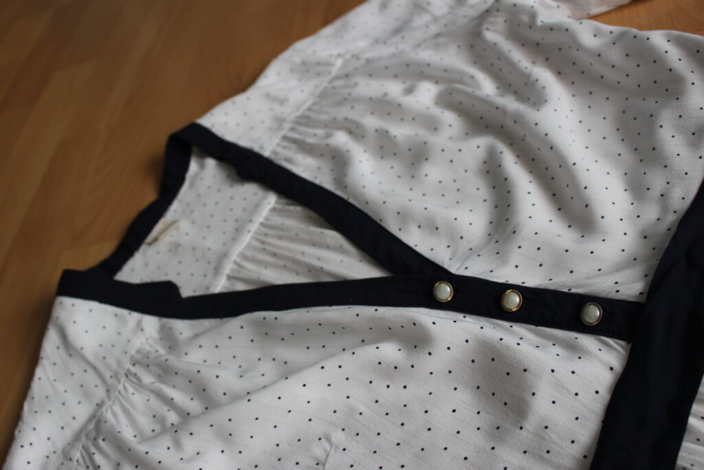 Na šaty jsem vytáhla ze zásob bílou viskózu s tmavěmodrými puntíčky a tenkým zlatým proužkem, ale vysnila jsem si vázačku, légu a stojáček v kontrastní tmavěmodré. To znamenalo, že jsem z légy musela udělat samostatný střihový díl (na šatech Myosotis je pouze přinechaná).