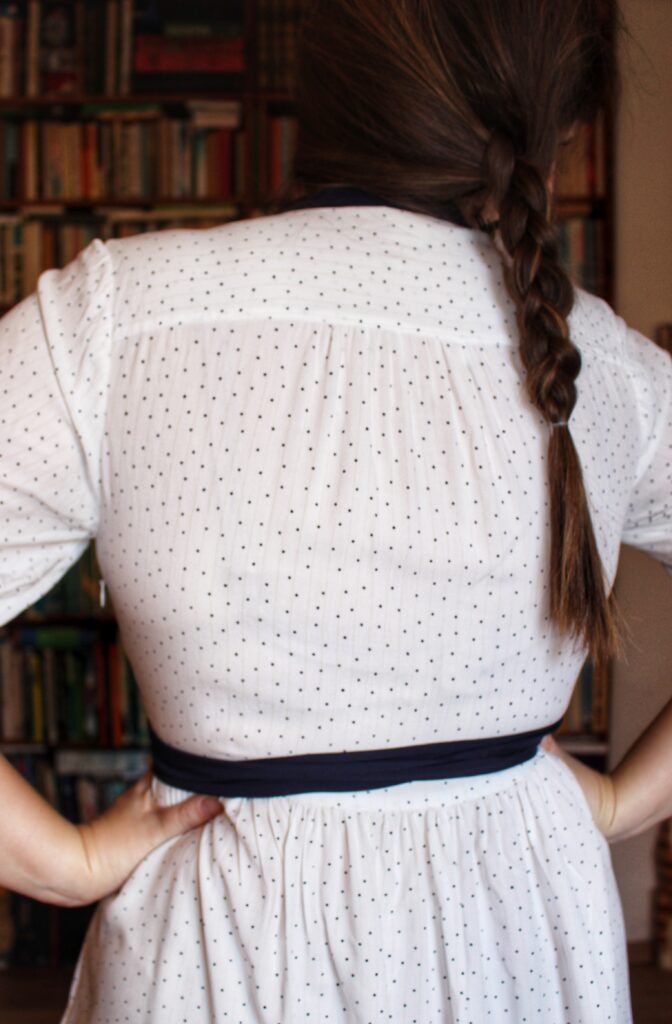 Nicméně je určitě patrné, že některé věci by ještě chtěly vylepšit. Vím, že téměř na každém střihu musím snížit prsní bod, ale samozřejmě jsem šaty chtěla mít rychle hotové, tak jsem to neudělala a jak vidíte, záševek je moc vysoko. Rukávy jsem také měla trochu prodloužit, aby vypadaly víc nabíraně. Chtěla jsem je mít jen po loket, tak jak jsou, ale víc látky by je udělalo objemnější.