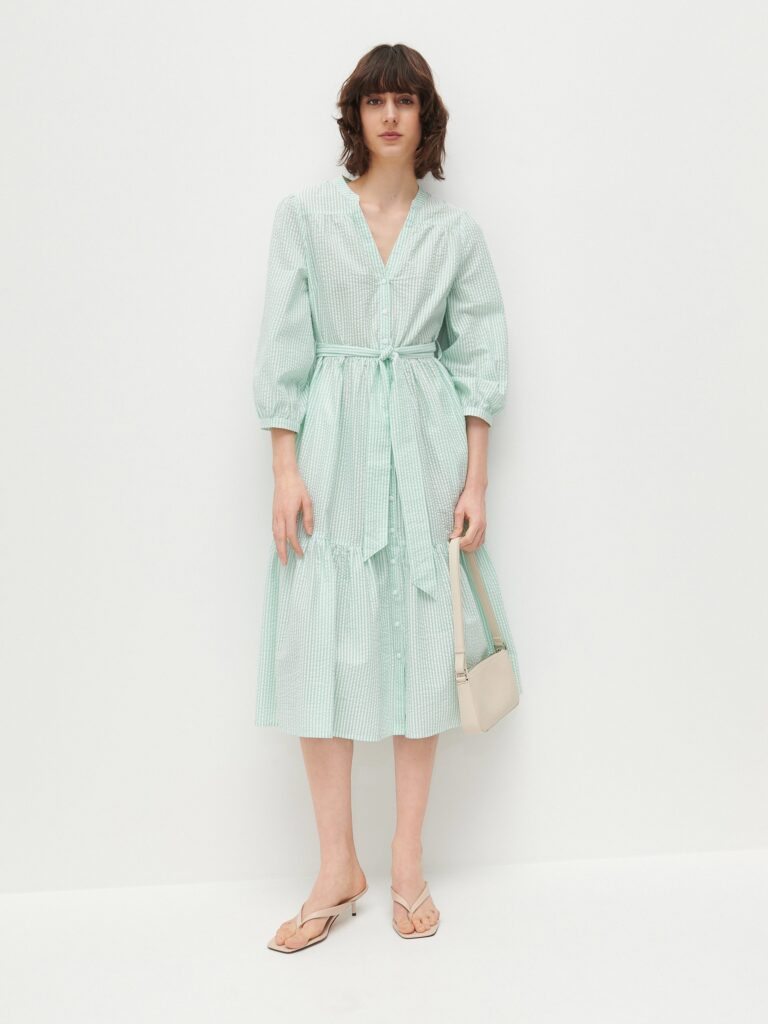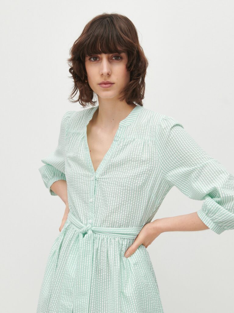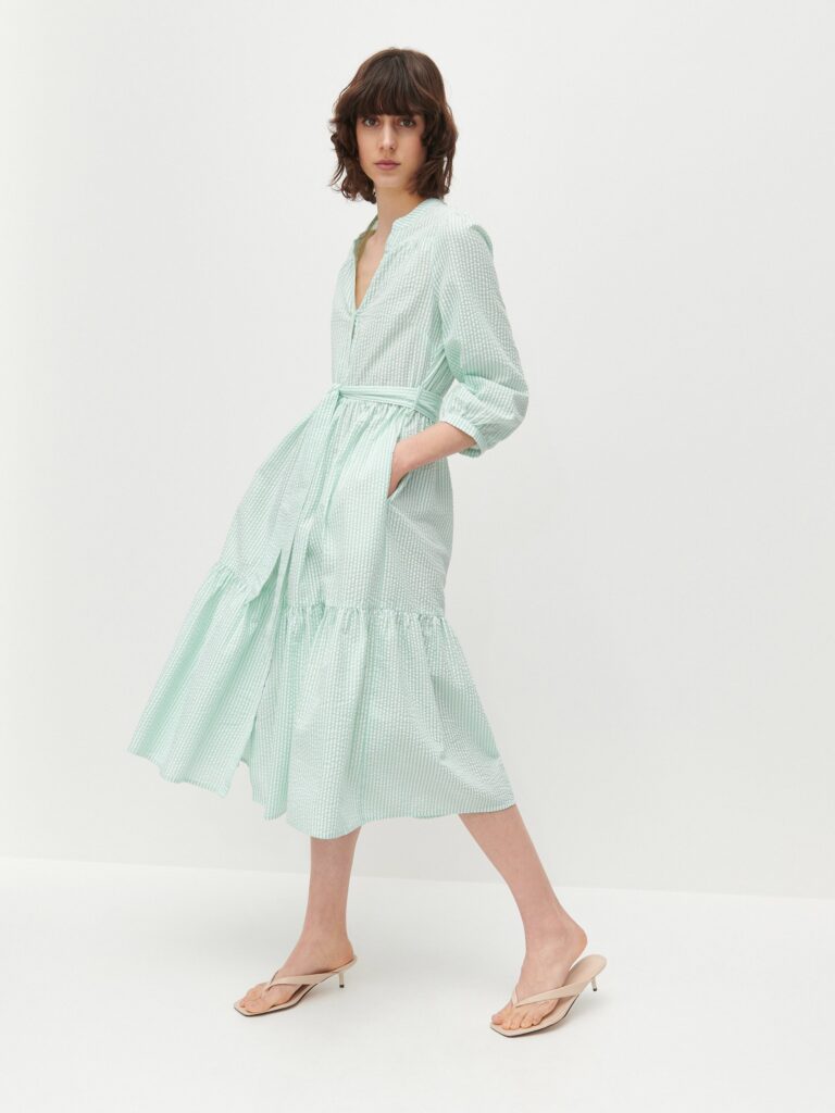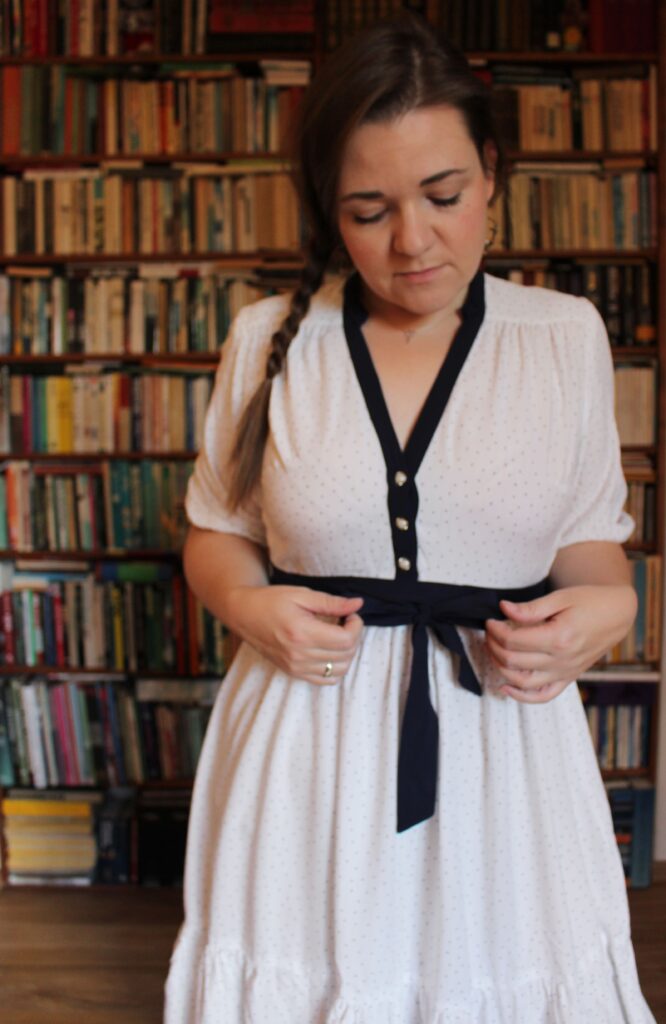 V létě mi Instagram tak dlouho ukazoval reklamu na tyhle šaty z Reserved, až mě přesvědčil, že je potřebuju. Ale nevedlo to úplně k výsledku, který by potěšil danou oděvní společnost, haha. Moc se mi na střihu líbily některé prvky – knoflíková léga, stojáček, přední a zadní sedlo, do kterých je nařasená část předního a zadního dílu, širší zřasené rukávy, řasená sukně s volánem…. Střih na šaty Myosotis od Deer and Doe mi přišel jako dobrý výchozí bod, zejména díky límečku a knoflíkové léze.