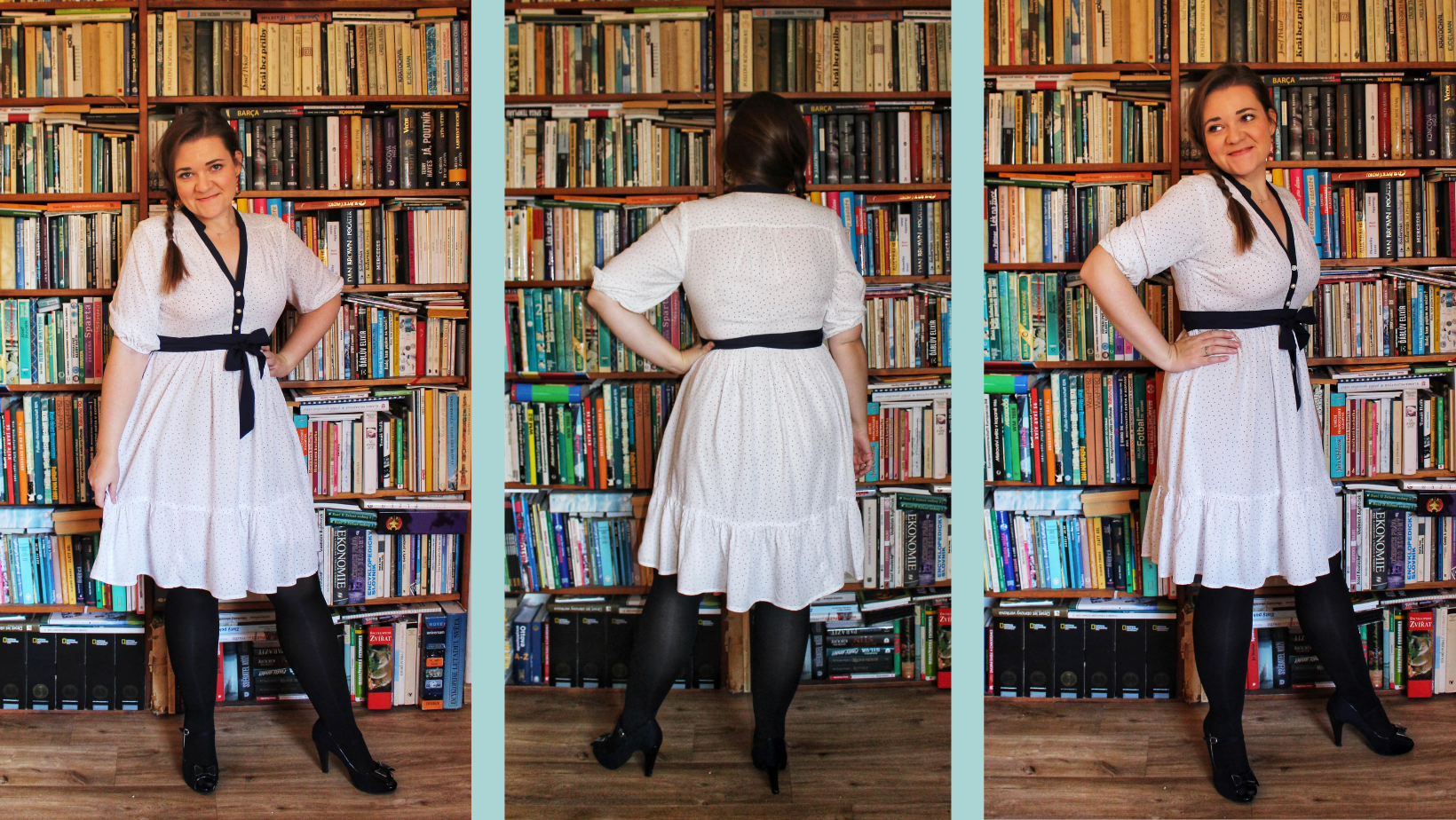 Et voilá, nové šaty jsou na světě! Dopadly skoro přesně tak, jak jsem si představovala. Moc se mi líbí kombinace bílé a tmavěmodré a mrzí mě, že ty zlaté proužky nejsou na fotkách skoro vidět, protože dělají šaty ještě zajímavějšími. Knoflíčky jsem použila perličkové se zlatými okraji ze zásob, které jsem dostala od mamky mojí kamarádky. Mám vždycky radost, když takovéhle poklady můžu použít.