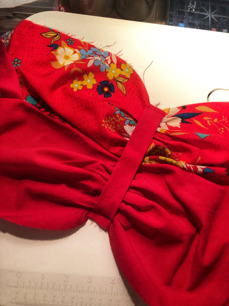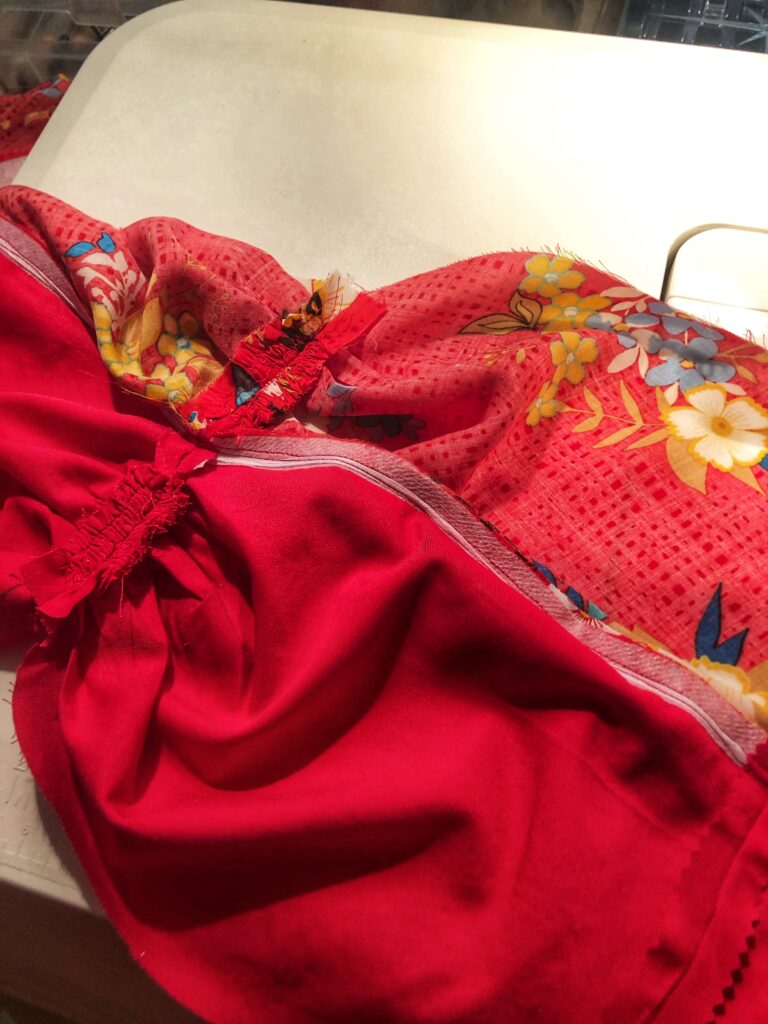 Ale jednu vadu na kráse přece jen mají. Ušila jsem je z levného zbytku směsové bavlny s polyesterem, protože jsem věděla, že budu do střihu hodně zasahovat a nechtěla jsem nic drahého. Zároveň to byla jediná hezky červená látka, na jakou jsem natrefila. A jelikož jsem chtěla malé červené, tak přes barvu zkrátka nejel vlak. Nicméně látky s příměsí polyesteru mají takovou nepěknou vlastnost, že nesnesou vysoké teploty. Obvykle z umělotin nešiju, takže jsem si neuvědomila jak velký problém to bude, než jsem vytáhla šaty z pračky a zděsila nad miliónem bublinek, které teď zdobí vyztužené pasové díly. Ještě jsem se je ani nepokusila vyžehlit, protože mám pocit, že to stejně nezachráním…. A představa, že je mám zase celé rozpárat a udělat pasové díly znovu, nejspíš jen podražené, protože nažehlovací výztuhu tam asi nikdy pořádně nenažehlím, je dost depresivní.